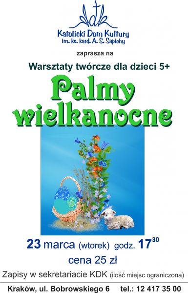 Zapraszamy serdecznie dzieci w wieku powyżej 5 lat na warsztaty plastyczne, w czasie których wykonają piękne palmy wielkanocne. Ponieważ ze względów sanitarnych ilość miejsc ograniczona, prosimy o zapisy telefoniczne. Cena 25 zł.