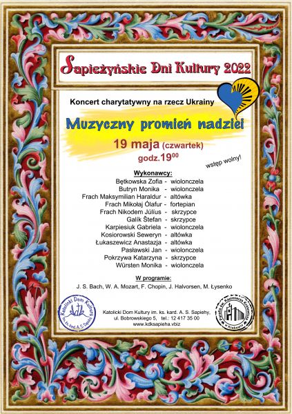 Po czasach ograniczeń powróciliśmy do organizowania Sapieżyńskich Dni Kultury, które zawsze odbywają się w maju, miesiącu urodzin naszego Patrona. 19 maja o godz. 1900 odbył się charytatywny koncert na rzecz Ukrainy pt. „Muzyczny promień nadziei”.